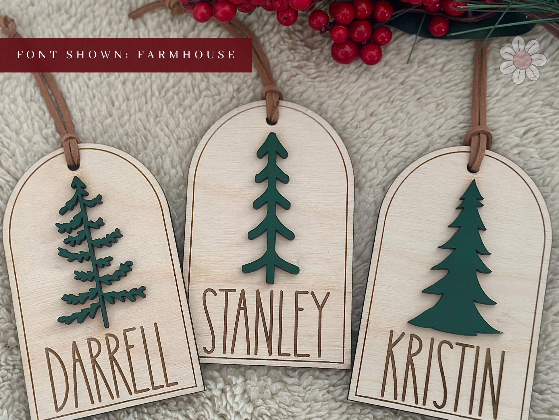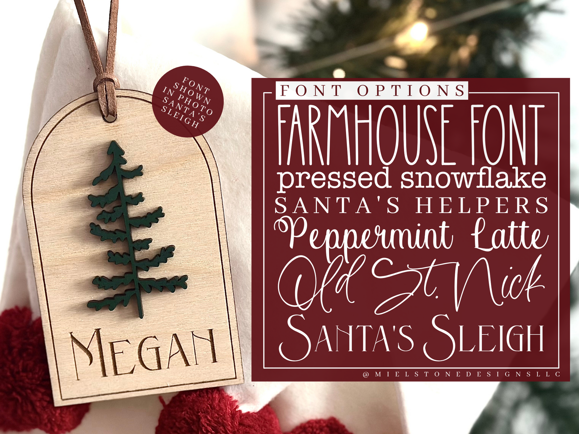 Enhance your Christmas stockings with our delightful farmhouse Stocking Name Tags! Crafted from two layers of high-quality wood, these tags are both sturdy and customizable, allowing you to choose your favorite font and tree style.